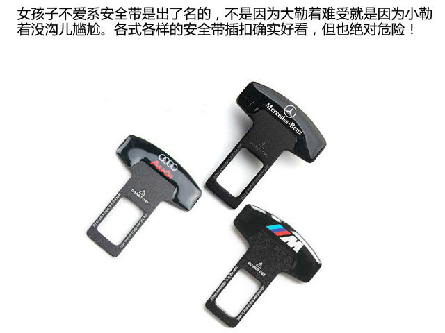 買了車后,特別是一些女孩子喜歡給自己的愛車裝飾裝飾。特別會(huì)在中控臺(tái)上擺了好多小東西,還會(huì)穿著高跟鞋開車等等這樣錯(cuò)誤的用車習(xí)慣。今天榮致汽車焊接件接下去2天會(huì)盤點(diǎn)車內(nèi)好看不好用的裝飾和一些不好習(xí)慣: 1.安全帶插扣 對(duì)于那些就不想系安全帶的人,安全帶插扣自然就誕生了,去看看自己身邊朋友的車準(zhǔn)保有一輛車上有這玩意,把它一插,警報(bào)不響,不用被安全帶勒著確實(shí)舒服,但你可知,汽車上的安全裝備發(fā)展到現(xiàn)在,什么各個(gè)部位的氣囊,主動(dòng)剎車,自適應(yīng)巡航都不如一根安全帶作用重要。
